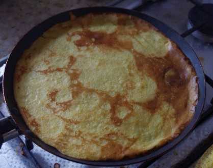 7. И так, налить в жарочную посуду тесто и повращать ее, чтобы оно растеклось тонким слоем. Подождать, когда краешки начнут слегка подсыхать, затем перевернуть на другую сторону. Времени для запекания с каждой стороны много не понадобится. И это время также зависит от материала из которого сделана Ваша посуда. Оно может составлять от 20 секунд с каждой стороны до минуты.