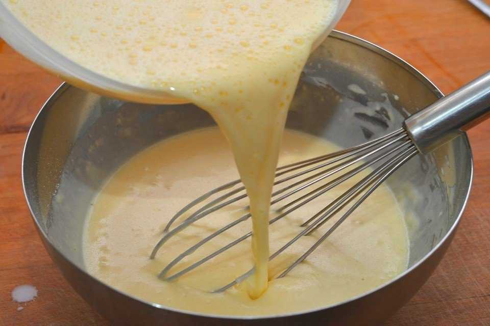 - К двум яйцам добавить 2 стакана молока, взбить до легкой пены, затем добавить 2 стакана муки и подсолить по вкусу.
