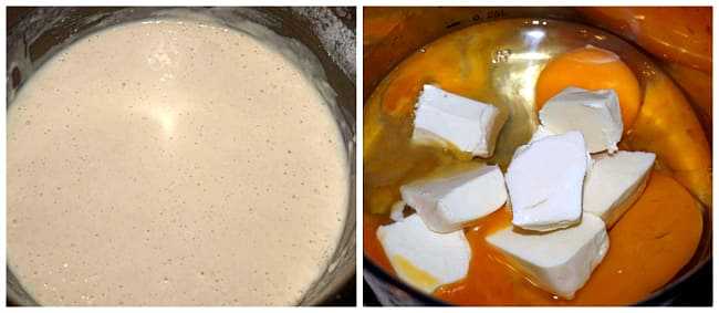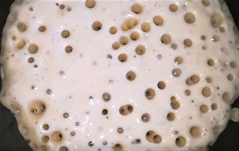 - Когда дрожжевая масса «запузырится» переливаем ее в миску с мукой.