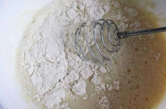 В полученную смесь постепенно добавляйте просеянную через сито муку, не забывая при этом помешивать массу. Для замеса лучше использовать венчик или миксер.