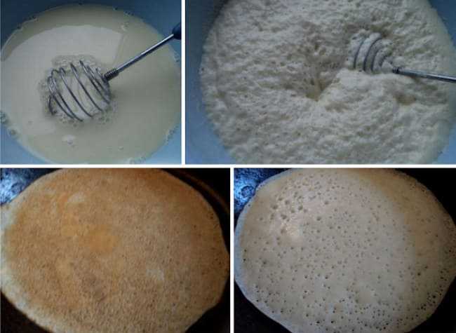 Дрожжевые блины готовятся по особой рецептуре. Изначально куриные яйца взбивают в пенную массу с солью и сахарным песком