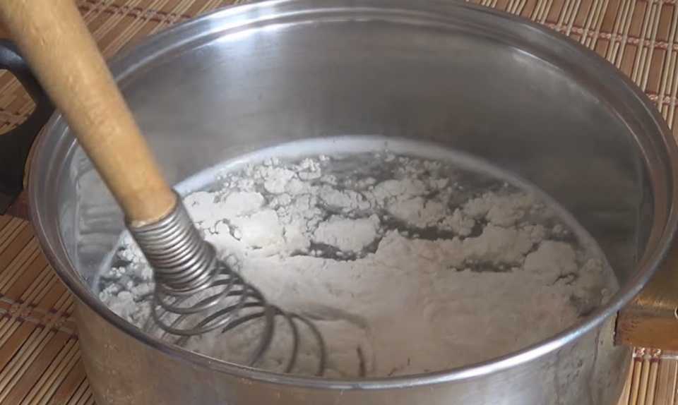 - Разогрейте жидкость. Добавьте муку. Взболтайте тесто для будущих блинов миксером или блендером.