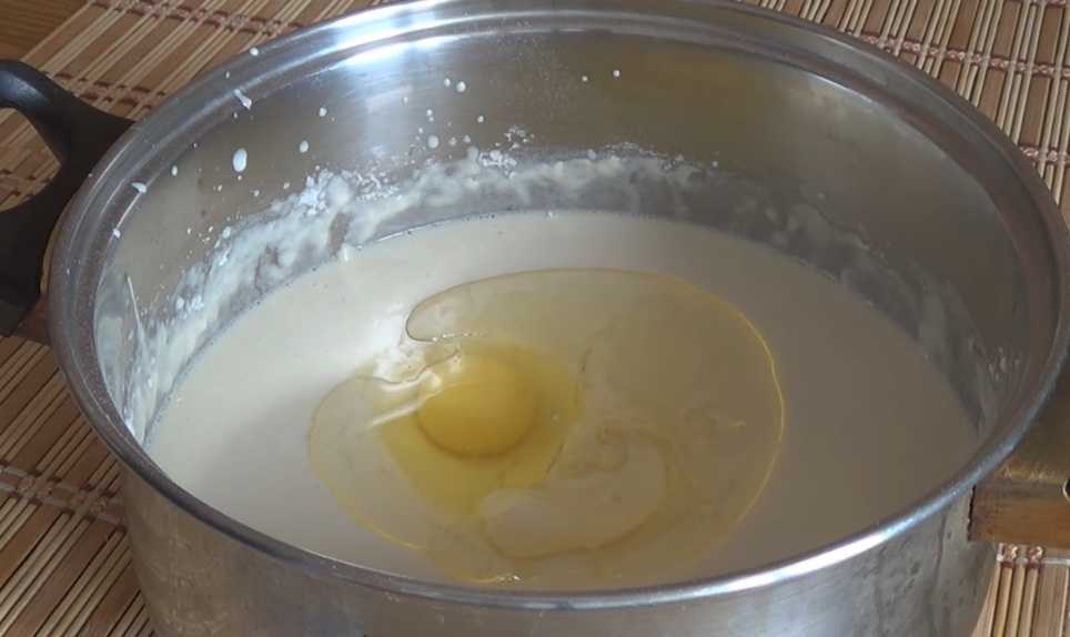 Подогреваю сыворотку теплее комнатной температуры. По ощущениям она будет хорошо теплой, но не горячей. Вливаю в яичную смесь, разбалтываю.
