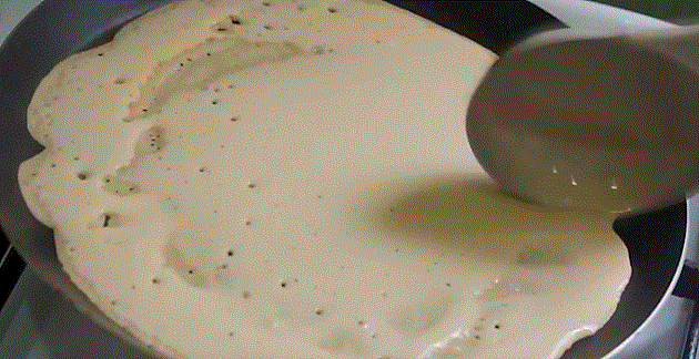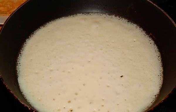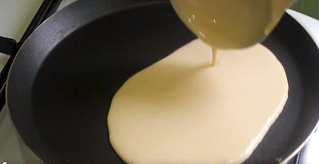 8. Сковороду ставим на средний огонь, прогреваем и наливаем половником тесто.