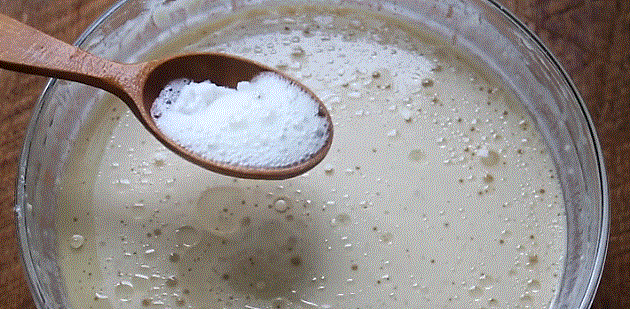 1. Вылейте молоко комнатной температуры в емкость для замеса теста и добавьте в него соду, предварительно погашенную уксусом. Тщательно размещайте до полного растворения.