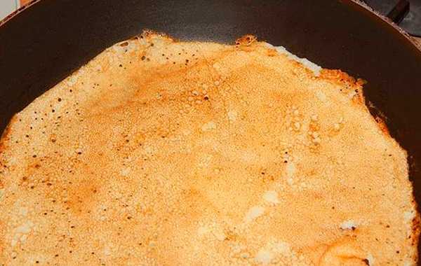 4. Далее сразу приступайте к выпеканию. Для этого смазываем раскаленную сковороду маслом, наливаем порцию теста и обжариваем с двух сторон.