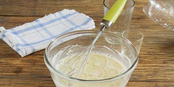 Разбиваем яйца в глубокую миску, добавляем сахар и соль, взбиваем миксером на слабой скорости или вилкой, вливаем теплую кипяченую воду и взбиваем снова.
