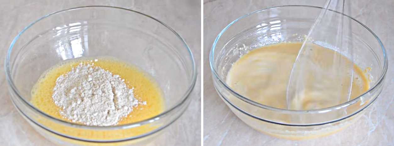 - Теперь всыпьте муку и постепенно наливайте молоко. Хорошенько взбивайте до однородного жидкого теста.