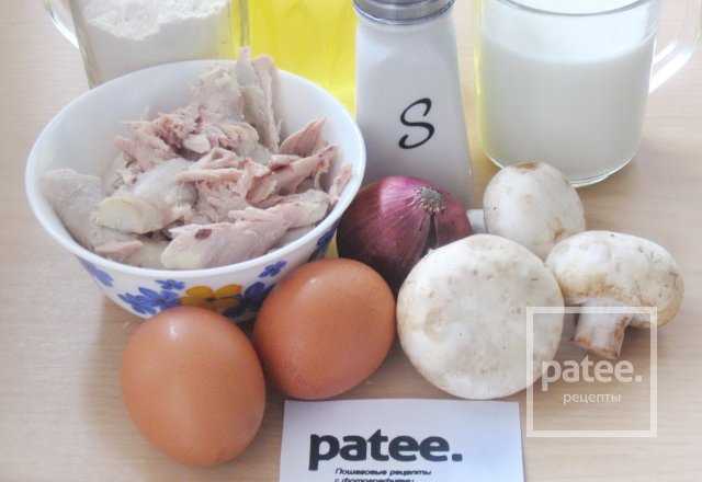Для приготовления блинчатых пирожков понадобятся такие продукты: отварное мясо(у меня курица), шампиньоны, лук репчатый, масло подсолнечное, молоко, яйца, мука, соль.