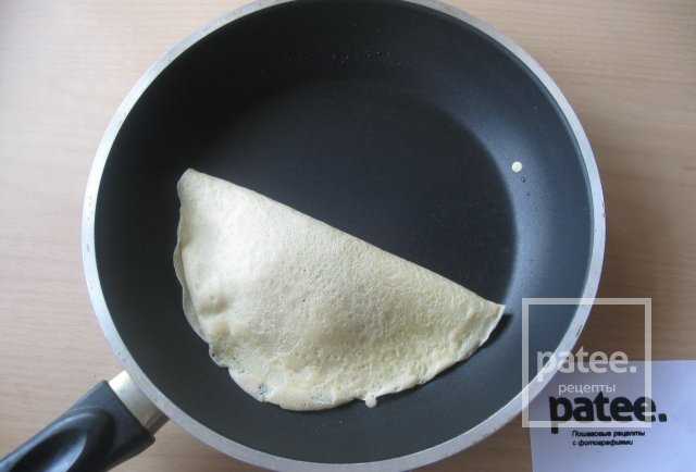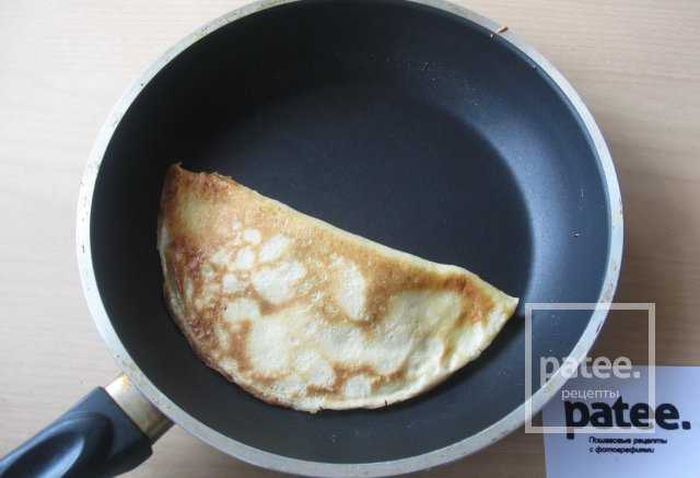 Сразу же лопаткой сворачиваем блин пополам и прижимаем края. За счет того, что тесто было еще сырым, края спекутся и наша начинка никуда не убежит. Накрываем крышкой, затем переворачиваем, опять накрываем крышкой. Примерно через полминутки достаем готовый блин.