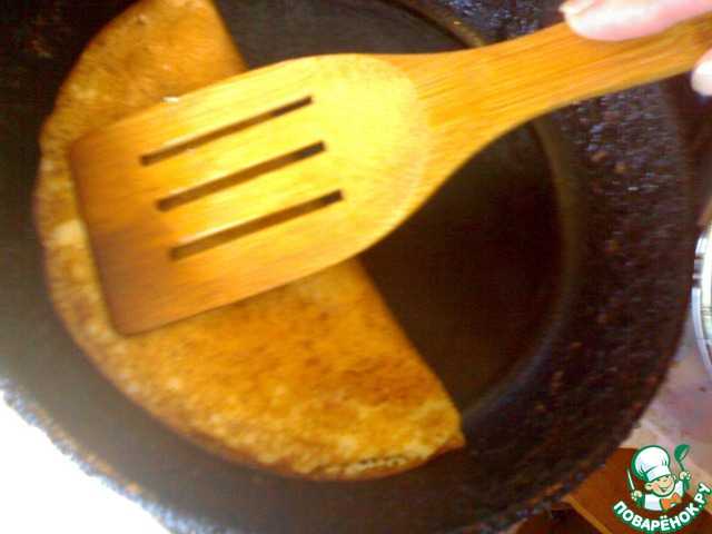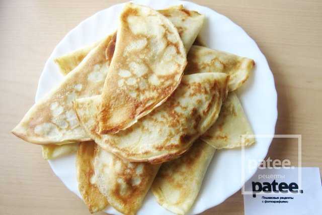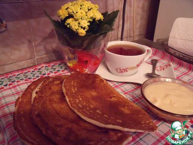 - Выпекаем блины на хорошо разогретой блинной сковороде, смазанной растительным маслом.