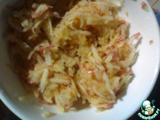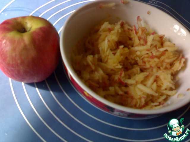 Тем временем натираем яблоко на терке. Я кожуру не снимаю, так как именно в кожуре яблока содержится большая часть витаминов, минералов и других питательных веществ, содержавшихся в целом плоде, и само собой, это- клетчатка.