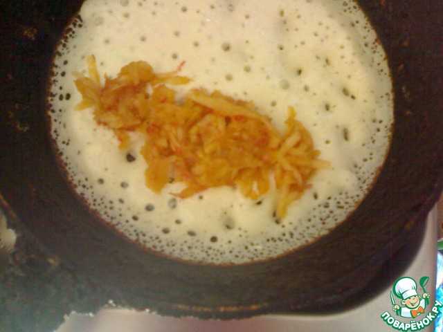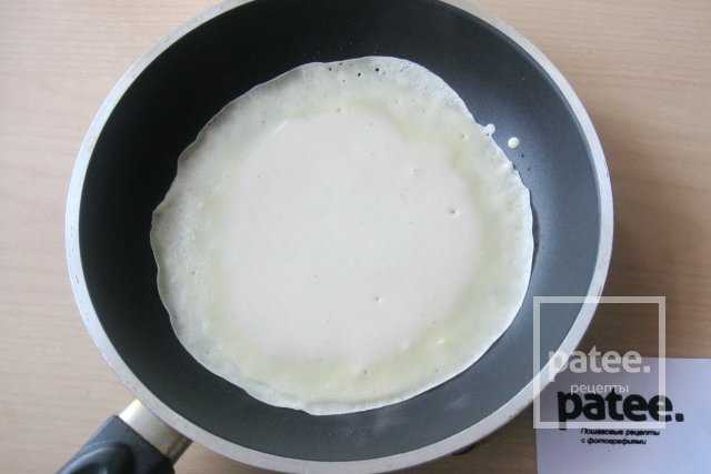 На горячую сковороду половником выливаем немного теста и печем блинчик две-три минуты, пока верх “схватится”и перестанет быть сырым.