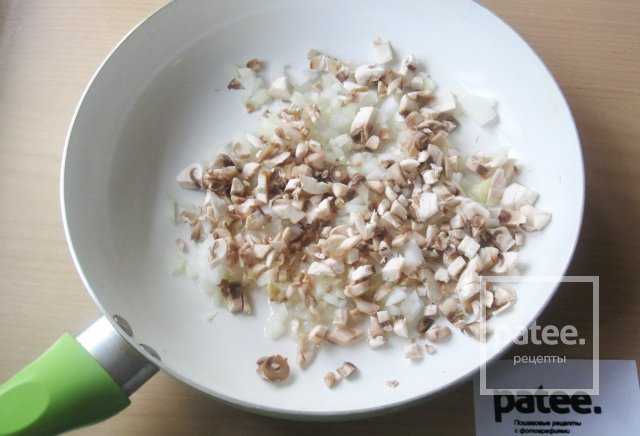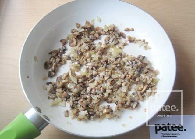 Обжариваем лук и шампиньоны на сковороде до готовности.