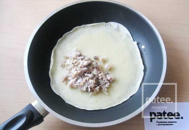 На половинку блина тут же выкладываем ложку начинки ближе к центру, не попадая на края.