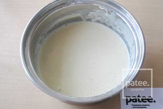 Тщательно перемешиваем яйца, молоко и муку с солью и сахаром. Получаем тесто для блинов. Комочков не должно быть. По консистенции тесто немного гуще, чем на обычные блины.