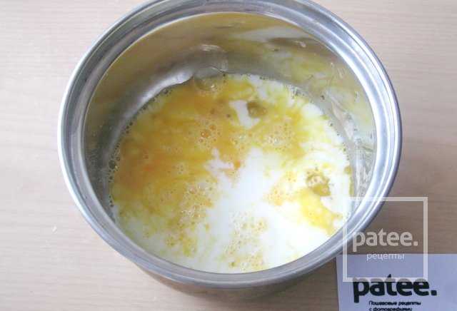 Добавляем молоко во взбитые яйца. Солим и опять перемешиваем.