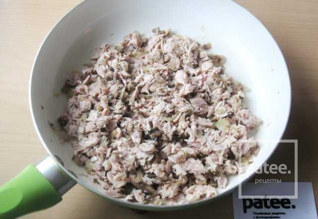 Соединяем нарезанное отварное куриное мясо с жареным луком и шампиньонами. Солим по вкусу. Начинка для пирожков готова.