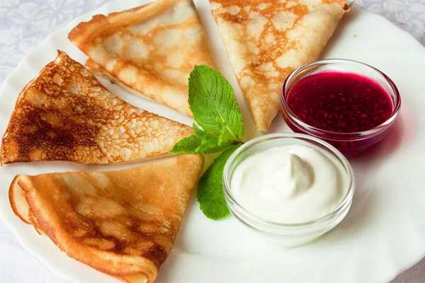 - блины можно испечь на маленькой сковороде, тогда вместе с ними к столу в соусниках подают обезжиренную сметану, йогурт или мёд, чтобы было удобно обмакивать свёрнутые в трубочку блинчики;