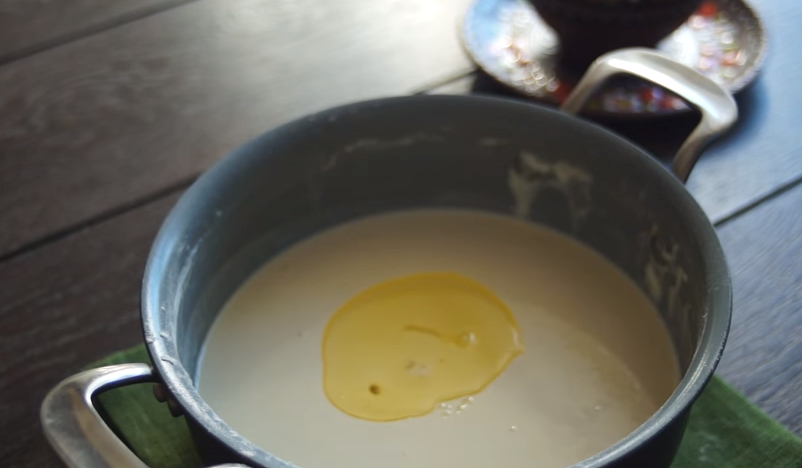 2. Поставить на средний огонь и помешивая немного согреть. Следить, чтобы он не стал створаживаться. Проверять температуру прогрева пальчиком, как станет теплым, огонь выключить.