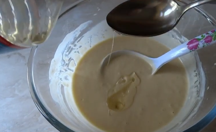 3. В конце взбивания добавьте подсолнечное масло. Консистенция теста должна напоминать жидкую сметану. Оставьте его на 10 минут.