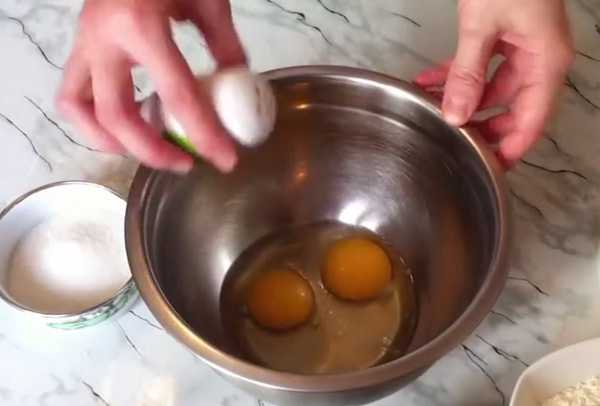 1. В миску с яйцами всыпаем соль и сахар. Всё хорошенько взбиваем обычным венчиком.