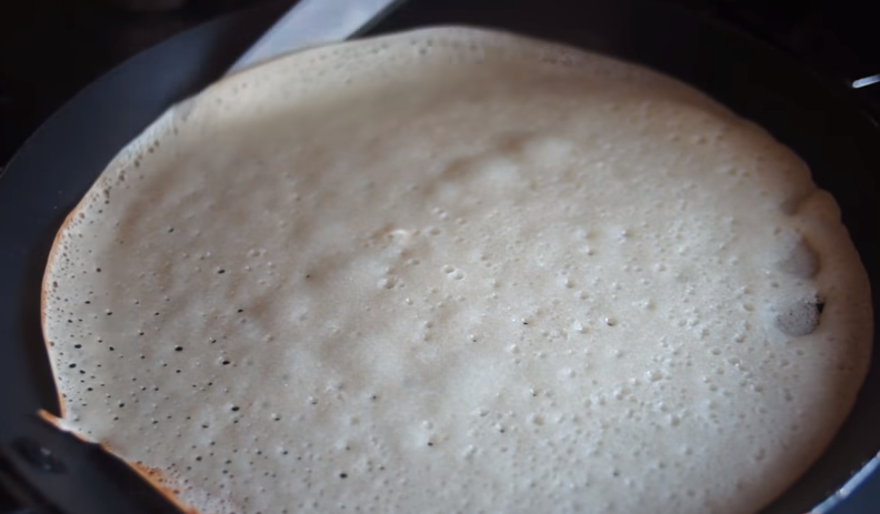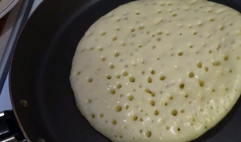 Когда наливаете тесто, нужно быстро поворачивать сковородку, чтобы тесто могло быстро растечься. В этом случае лепешечка получится тоненькой. А раз она будет тонкой, значит на ней будут и всеми любимые дырочки.