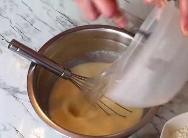 - Затем постепенно всыпаем муку (для лучшей консистенции муку лучше заранее просеять с помощью сита). Когда вся мука высыпана, тщательно перемешиваем смесь, чтобы избавиться от комочков.