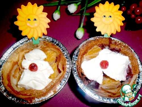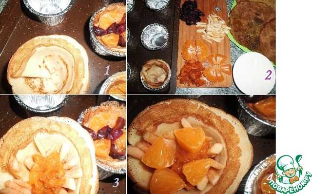 Укладываем каждую заготовку в подготовленные формы. Первым слоем в «лукошко» выложить на дно и по стеночкам яблоки. Затем абрикосы, мандарины, между дольками — вишню.