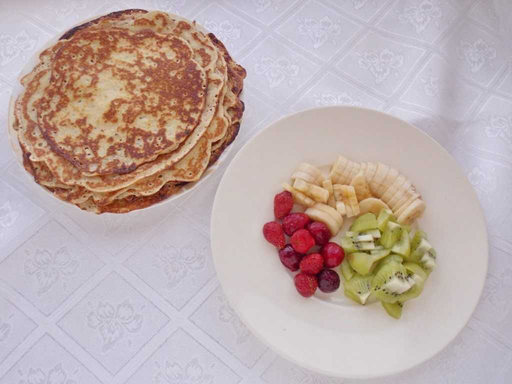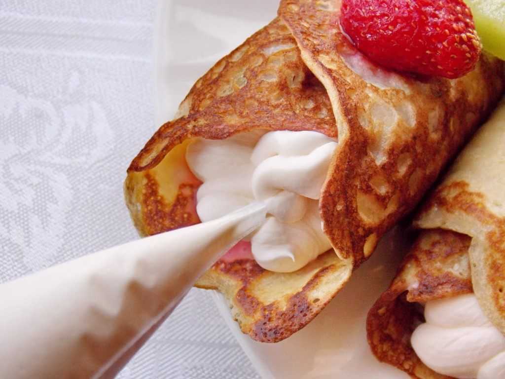 Подаём блинчики со сливками и фруктами к чаю, кисломолочным продуктам (кефиру, йогурту) или какао.