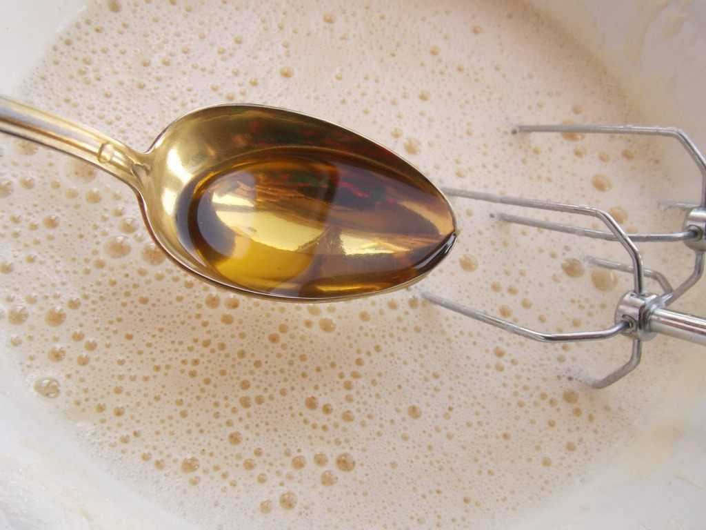 Во взбитые яйца очень тонкой струйкой, не прекращая взбивание, вливаем кипяток. Не беспокойтесь — яйца не свернутся, главное — вливайте потихоньку и продолжайте взбивать. Масса станет пышной и начнёт расти пенной шапкой.