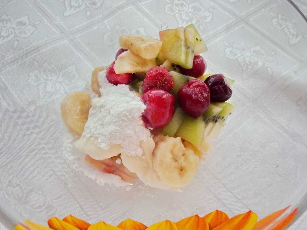 Кусочки фруктов и ягоды соединяем с половиной сливок, добавляем сахарную пудру по вкусу и перемешиваем. Чтобы десерт получился не очень калорийным и жирным, а максимально полезным, берём фруктов побольше, а сливок, наоборот, поменьше.