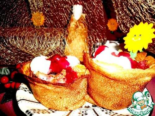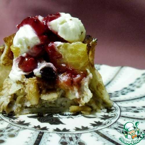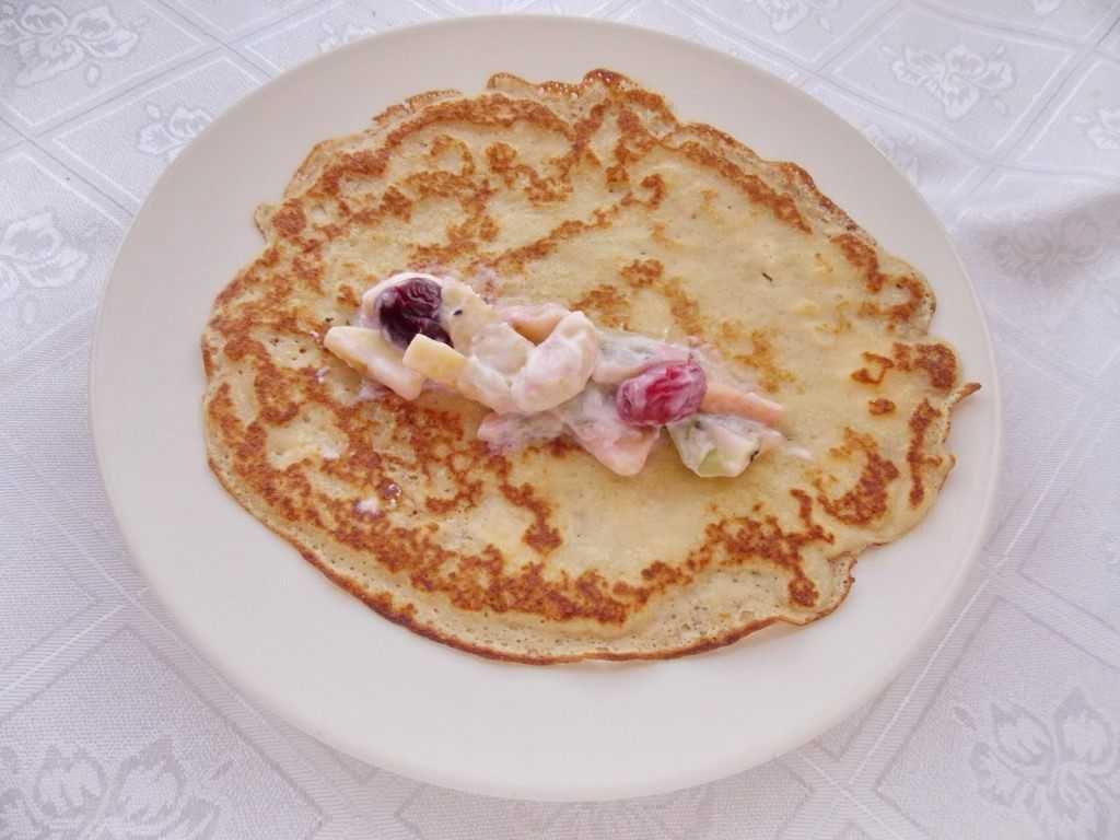 Заварные блины на кефире с фруктами и взбитыми сливками готовы. Приятного аппетита!