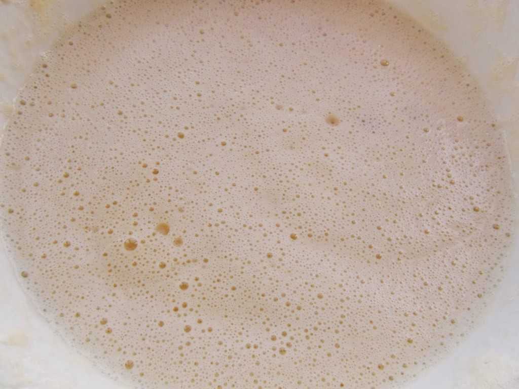 Закладываем дрожжи в теплую воду +1 ст. л. сахара + 3-4 стол. ложки муки.