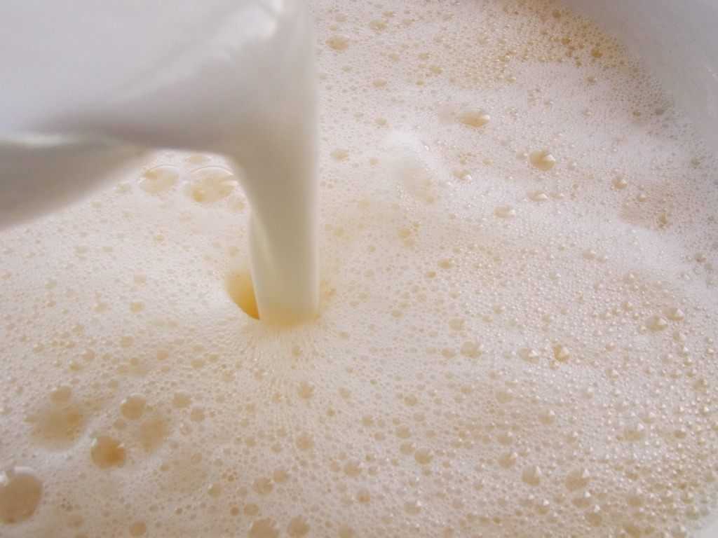 Влив весь кипяток, следом вливаем кефир. Теперь можно перемешать ложкой.