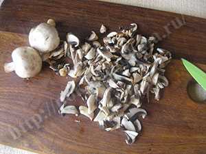 Шампиньоны или плоды любого другого сорта помыть под водой и измельчить. Далее их можно обжарить на сковороде до появления золотистого цвета или потушить в мультиварке. Добавить к массе измельченный лук.