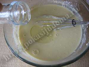 Добились нужной густоты? Смело добавляем около 2-3 ст.л. растительного масла – это нам поможет предотвратить пригорание и приставание блинчиков к сковороде.