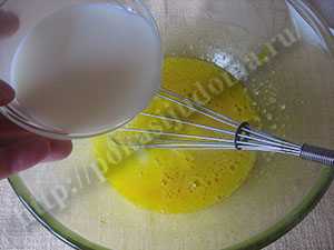 После того, как мы в пену взбили сахар с яйцом, добавим туда же молоко и воду. Опять-таки количество жидкости будет зависеть от того, сколько блинов вы хотите получить в итоге.