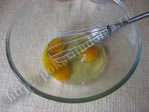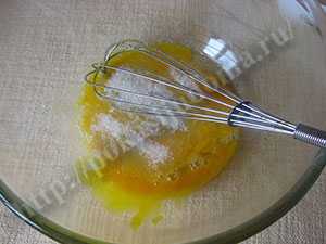 1. В глубокую тарелку необходимо насыпать муку, добавить соль и вбить яйца.