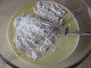 Чтобы приготовить блинчики на молоке, начинаем вмешивать в смесь муку. Делаем это до консистенции чуть жиже, чем на оладьи.