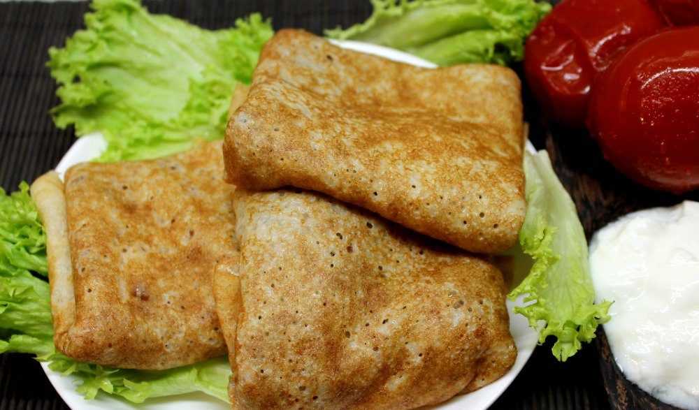 Тесто для блинов подойдет любое, но только жидкое. Подойдет заварное, кефирное, на молоке или воде. С начинкой разнообразия больше. Самый простой вариант — шампиньоны. Но можно брать и лесные грибочки. Их сдабривают овощами, специями — получается «пальчики оближешь»!
