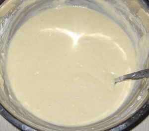 - Затем вливаем жидкость (молоко, воду или прочее) и тщательно размешиваем вилкой или венчиком.