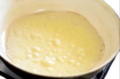 - Разогреть сковороду с удобной ручкой на большом огне, смазать несколькими каплями растительного масла под первый блин. Растопить 100 г сливочного масла, слить в чашку и поставить возле готовящегося блюда.
