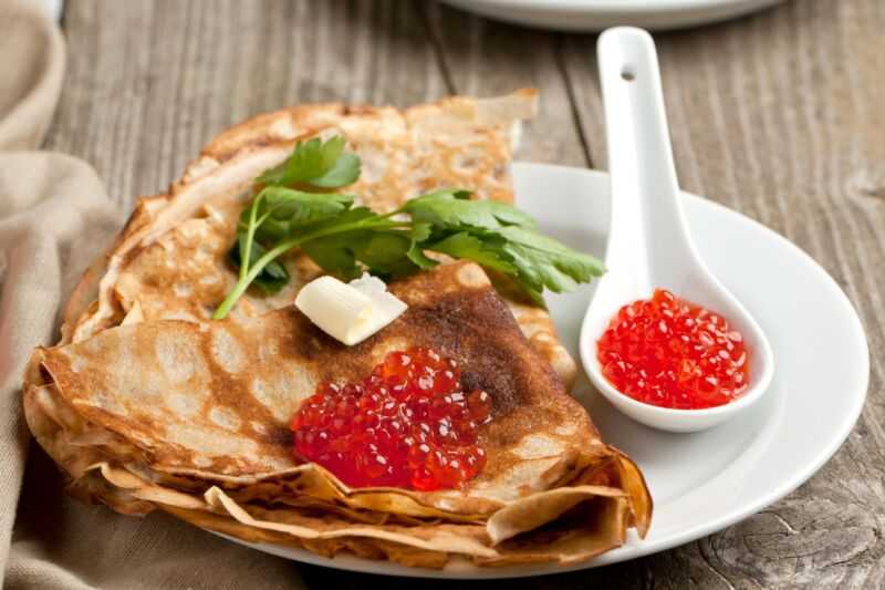 Однако, налистники не должны быть с дырчатым рисунком. Они должны быть достаточно большими, относительно плотными и одинаковой толщины. Именно такие блины подают с черной осетровой или красной лососевой икрой.