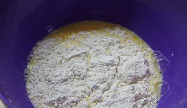 Всыпать просеянную пшеничную муку, перемешивая тесто венчиком. Масса на данном этапе получится довольно густая, поэтому никаких комочков не останется