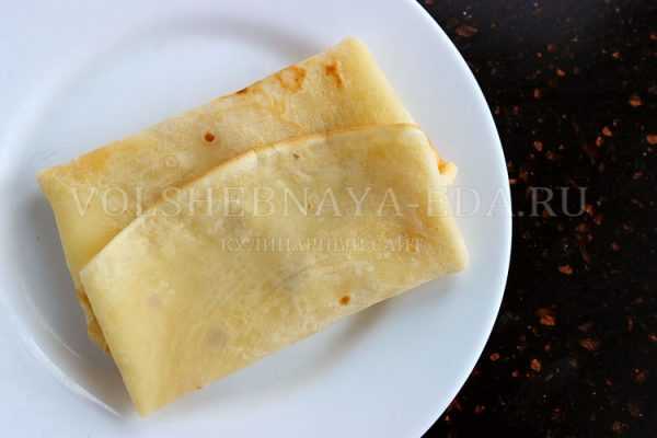 - Блины не должны быть слишком тонкие, ведь для такой закуски нужно более пышное изделие. Если в сковороду налить слишком много теста, оно не успеет испечься.