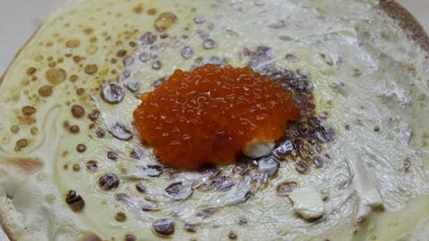 Поэтому воспользуйтесь одной маленькой хитростью: смажьте блинчик густой сметаной или сливочным сыром. Это позволит связать икринки между собой, равномерно распределить по блинчику и, конечно, разнообразить вкус блюда.
