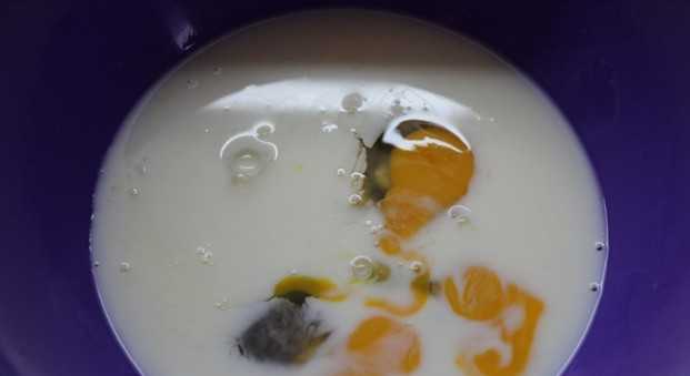 В глубокой емкости смешайте молоко и яйца. При помощи миксера доведите смесь до однородного состояния.
