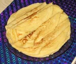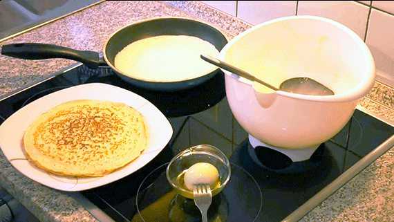В начале приготовим сами блины. Вот пара секретов для того, чтобы блины лучше растекались (были тоньше) и легче переворачивались: