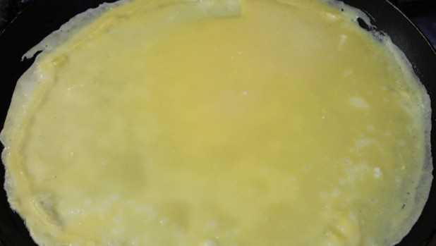 - Влить в сковородку небольшое количество теста, и распределить пластом по всему днищу.